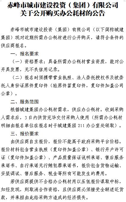 赤峰市城市建設(shè)投資(集團)有限公司 關(guān)于公開購買辦公耗材的公告